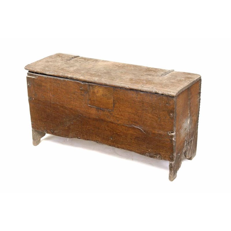 A Charles II boarded oak chest, on cut out ends, 18.75in (47.5cm) h, 35.75in (90.5cm) w, 13.75in (34.8cm) d. Hinges replaced, lacking lock and filled.