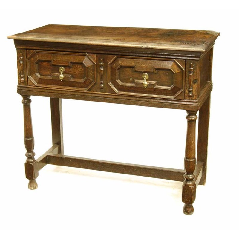 An oak serving table, fitted a geometric panelled drawer, on baluster turned legs united by an 'H' stretcher, 35.75in (90.6cm) h, 41.5in (105.4cm) w, 19.5in (49.4cm) d.