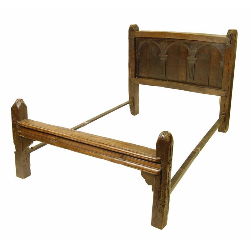 An oak bedstead, with a panelled headboard having three arches with incised stars and fluted pilasters, with a deep moulded bar footboard, with later iron supports for rails, 17th century and later, 48in (122cm) h, 53in (134.5cm) w.