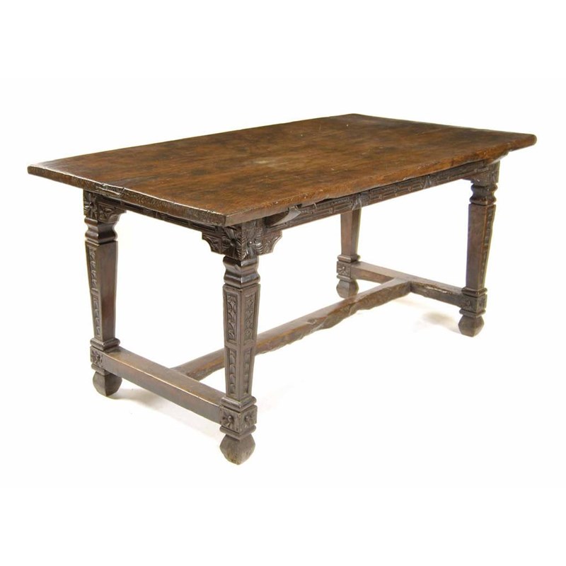 A Spanish chestnut and walnut farmhouse table, the single plank top to a carved base with square tapering supports united by an 'H' stretcher, 18th century and later, top and base associated, 29.25in (74.4cm) h, 62.5in (159cm) w, 32in (81cm) d.