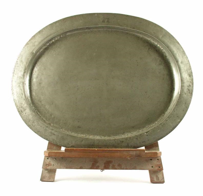 A massive oblong pewter serving dish, with a wide border having a double crest, the reverse stamped with two 'crowned 'X's' flanking 'MADE IN LONDON', and 'SUPERFINE HARD METAL', worn, probably 19th century, with an easel, 35.5in (90cm) w, 26.5in (67.4cm) d.
