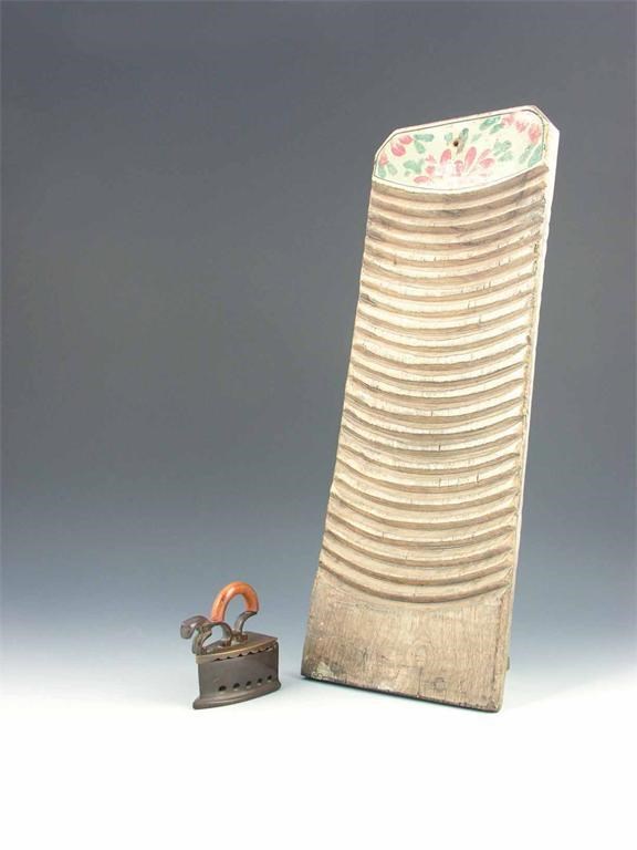 An elm wash board, with opposing curved ribs either side and polychrome decoration to the top on one, 19.75in (50cm) l, and a small brass smoothing iron. (2)