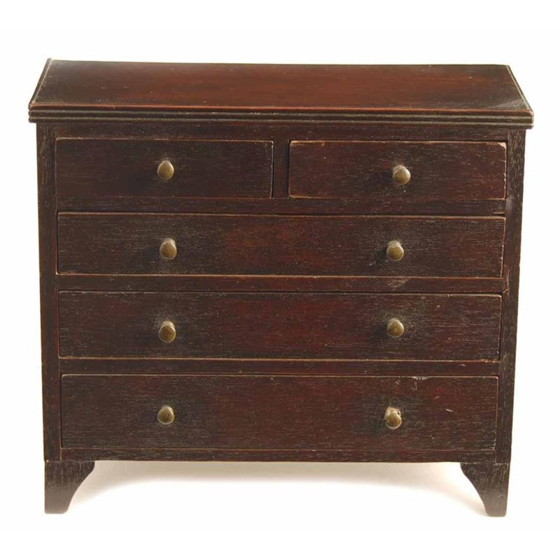 An early 19th century mahogany miniature chest, with a reeded edge top above two short and three long graduated drawers, fitted brass handles on splay bracket feet, 7.5in (19cm) h, 8.25in (21cm) w, 3.5in (9cm) d.