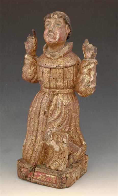 A carved giltwood figure of St. Francis kneeling receiving the stigmata, with polychrome decoration, possibly 16th century Spanish, 16.25in (41cm) h, 7.75in (19.6cm) w. Allover worm, damage and losses.
