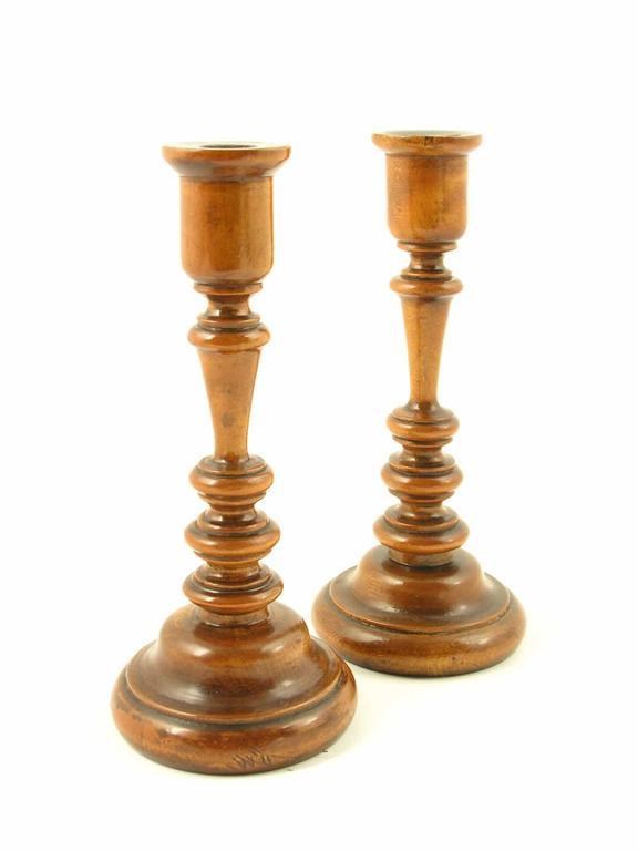 A pair of early 19th century turned beechwood candlesticks, with tapering and multi knopped stems, 10.5in (26.5cm) h. (2) Slight variations.