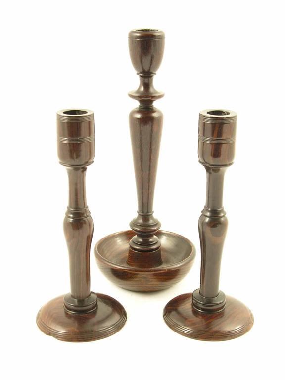 A pair of turned hardwood candlesticks, 8in (20.4cm) h, and a turned oak candlestick, all 20th century. (3)