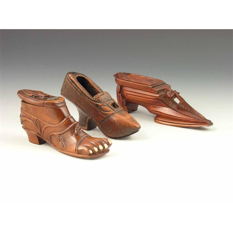 A 19th century continental carved shoe snuff, with a hinged cover and bone toes, 2.25in (5.6cm) h, 5.25in (13.4cm) l, and two others. (3)