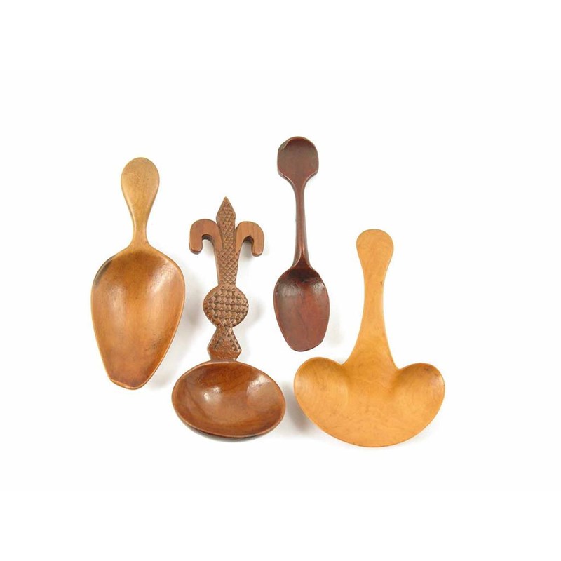 A late 18th century treen caddy spoon, with an oval bowl and stylized thistle, 4in (10.2cm) l, a boxwood caddy spoon with a gorget shaped bowl, a 19th century treen caddy spoon and a miniature treen spoon with a curved terminal. (4)