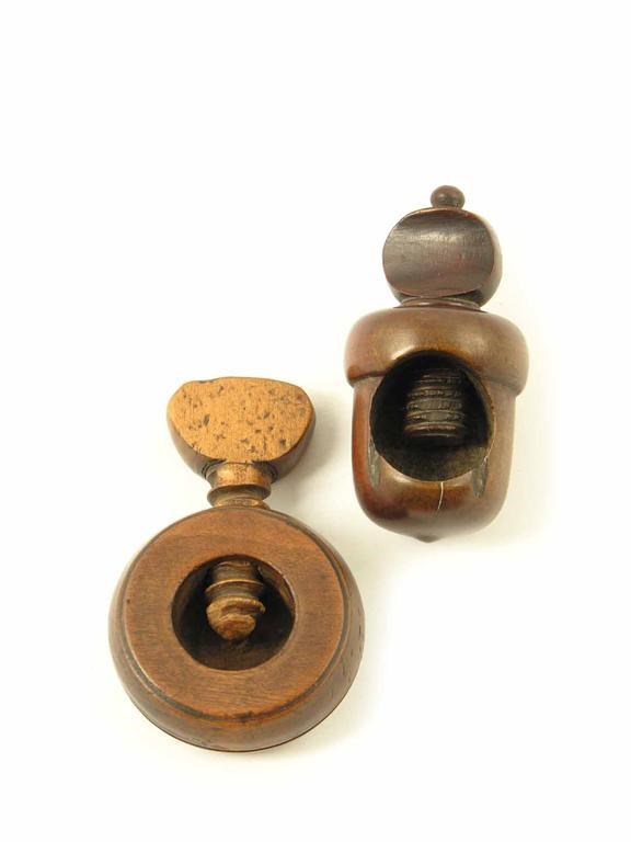 An 18th century treen nutcracker, modelled as an acorn with a thumb screw, 2.75in (7cm) l, and another 18th century treen nutcracker, of disc from. (2)