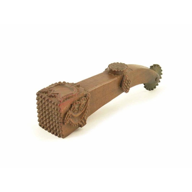 A 19th century sycamore love token pie crimper, carved a bird, a tulip, a heart above a lozenge, a cross and a floret, 5.5in (12.6cm) l.