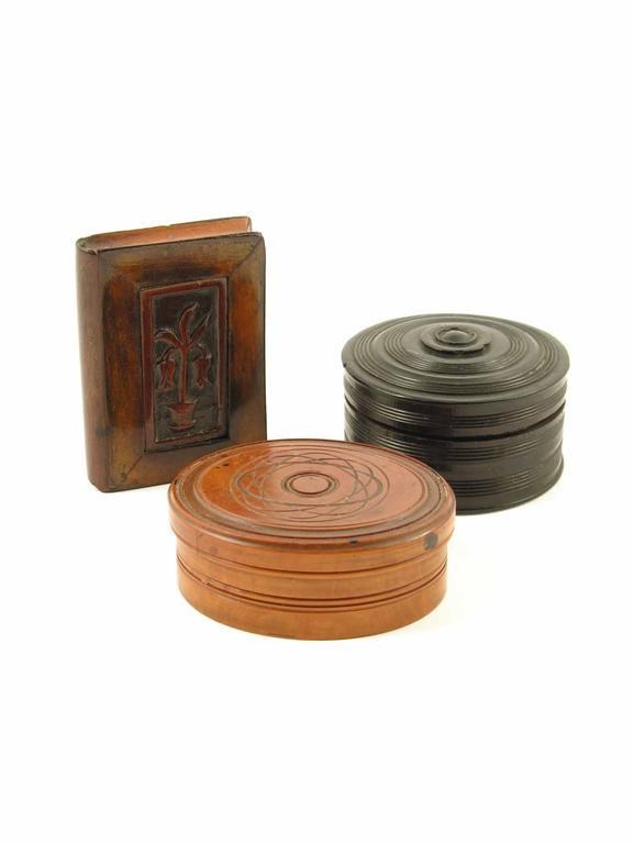 An early 18th century oval boxwood snuff box, with a concentric design to the cover, 3 1/8in (8cm) w, an 18th century treen circular snuff box with reeded bands, 2.75in (7cm) dia, and a 19th century snuff 'book' box. (3)