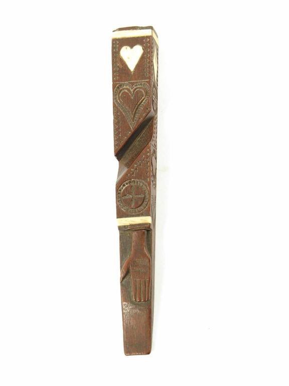 A Regency carved treen and bone inlaid knitting sheath, inscribed 'Eleanor Stokoe June 14 1813,' inset a heart and two diamonds and carved a diamond, a heart, a spade, a club, two circular cross motifs and an open hand, 6in (15.2cm) l.