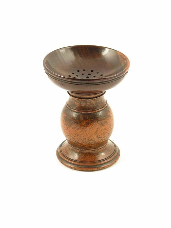 An 18th century turned lignum vitae pounce pot, with a threaded and pierced top, 4in (10cm) h.