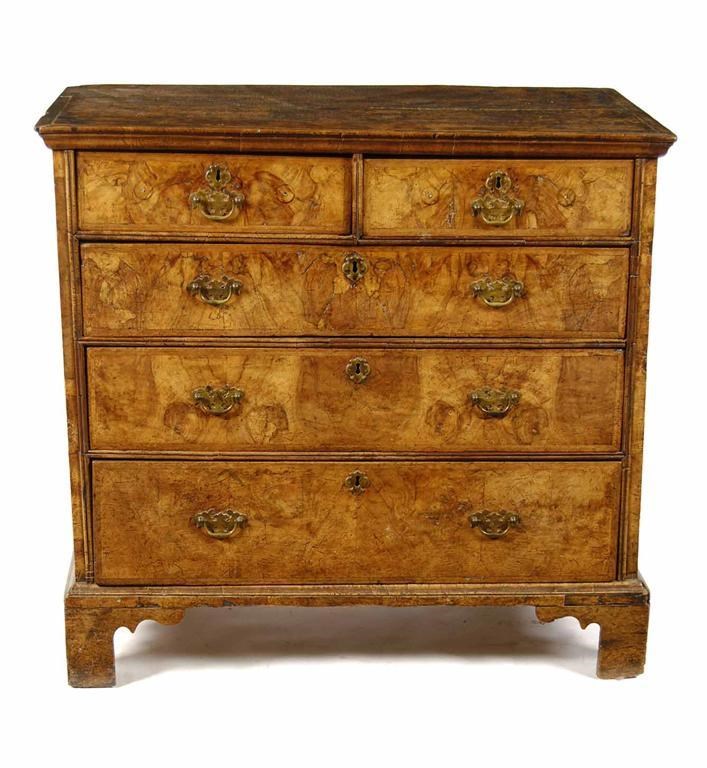 An early 18th century walnut chest, the oak top and sides above two short and three long graduated drawers, on bracket feet, 37.5in (95cm) h, 40in (102cm) w, 23in (58.6cm) d. Cracks to top and sides, back feet replaced, restorations.