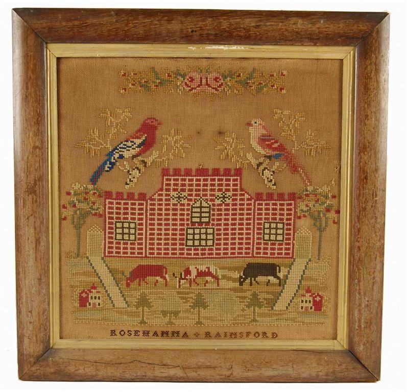 A Victorian sampler by Rosehanna Rainsford, worked birds, foliage and a castle, with cows in the foreground, 17in (43cm) square, in a rosewood frame.