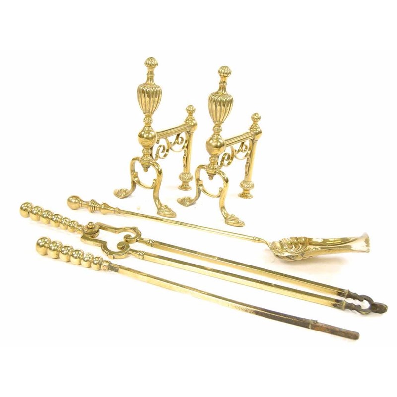 A pair of brass fire dogs, 13.5in (34.3cm) h, 8in (20cm) l, and a harlequin set of brass fire tools, 29in (73.2cm) l. (5)