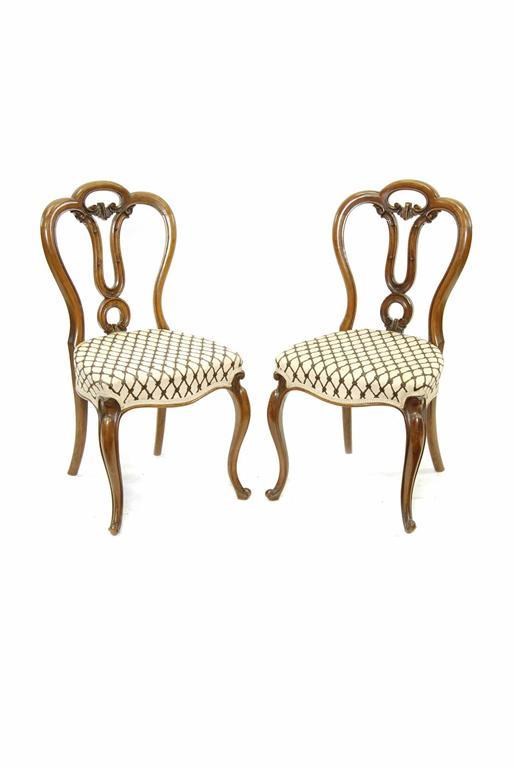 A set of six Victorian walnut dining chairs, by John Reid & Sons, Leeds, each with a foliate carved and pierced splat to a stuffed over seat and on moulded cabriole front legs, with a paper label to the underside inscribed 'JOHN REID & SONS, UPHOLSTERERS, 24 MEADOW ROAD, LEEDS, NO: 41872, NAME OF WORKMAN: J. Calvert'. (6)