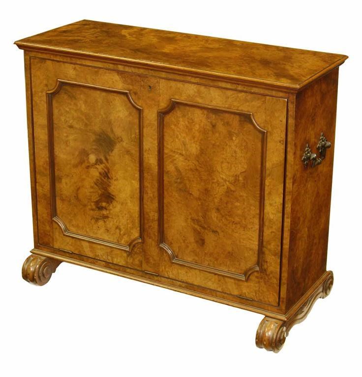 A Victorian walnut double sided library folio cabinet, the moulded edge top above a twin panelled hinged fall to each side, with handwritten paper labels, 'Cabinet 2, Division 1', 'Cabinet 2, Division 2', with bronze side carrying handles, on scroll supports, previously on castors, 29.5in (74.8cm) h, 34.5in (87.3cm) w, 17.5in (44.4cm) d.