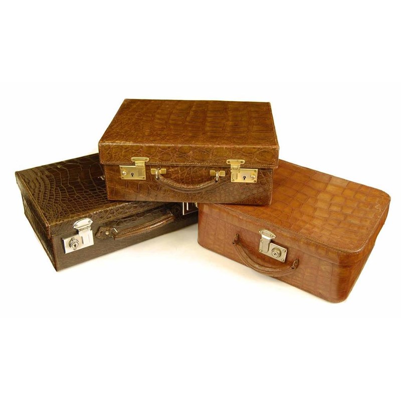 A crocodile small case, stamped 'BRUFORD & SON LTD EXETER & EASTBOURNE' with a suede lined interior 14in (35.5cm) w, a crocodile small case with stamped initials 'E.E.C.H.' with a suede lined interior, a crocodile small case having a leather interior with internal belt and easel mirror. (3)