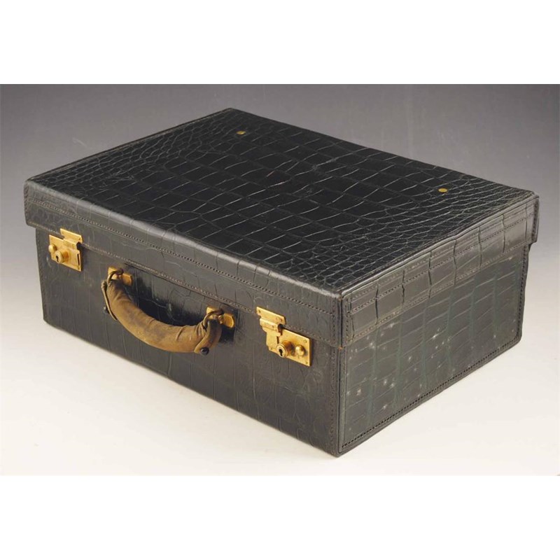 A stained green crocodile toilet case, by Finnigans, New Bond Street, London, the cover previously with initials to a silk lined interior previously fitted, 16in (40.5cm) w, with canvas outer case.