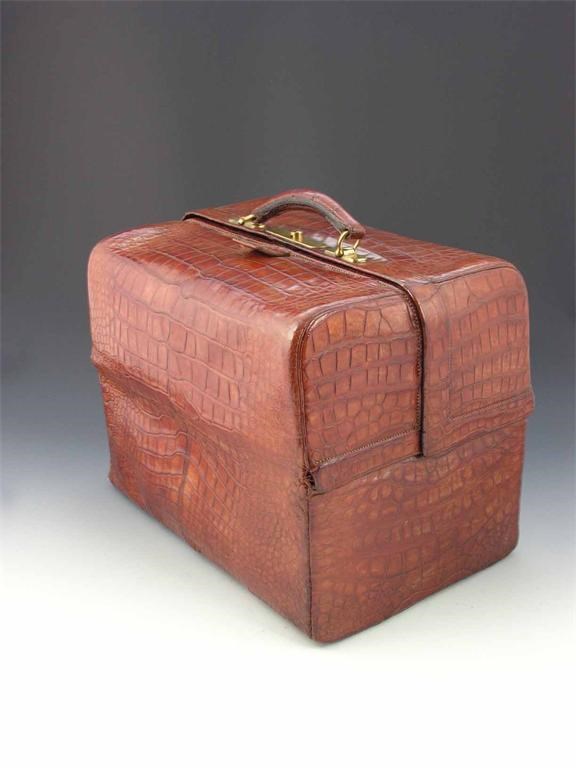 A crocodile Gladstone bag, with brass mounts and a leather lined interior, 15in (38cm) w.