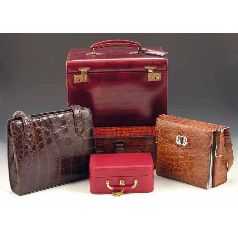 A crocodile and chrome mounted lady's handbag, with a hinged front having an inset mirror, a London made crocodile handbag, the compartmented interior with a small mirror, a faux crocodile vanity case, a red leather lady's toilet case retailed by Harrods and an Asprey and Garrard faux snake skin jewellery box. (5)