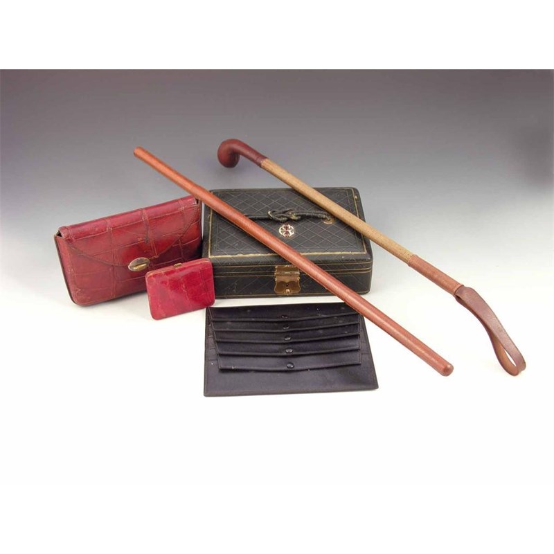 A green leather games box, the lid with an applied enamelled monogram 'I E S' with a divided interior for cards and with a gilt metal topped cribbage board, a crocodile wallet gilt stamped for 'P H Lehmann & Cie, Lausanne', a red stained card case, an Asprey, London five pocket wallet, a leather swagger stick and a riding crop. (6)
