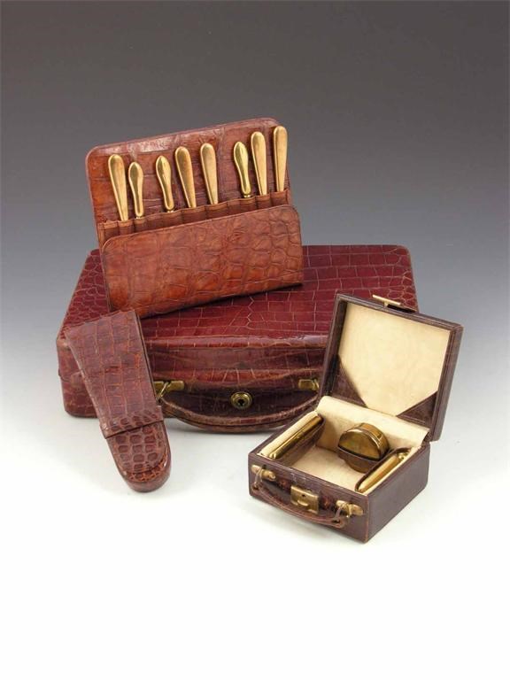 A crocodile jewellery case, the plush lined interior with a concertina tray, the brass Bramah lock missing its mechanism, 12in (30.5cm) w, a crocodile manicure set with eight gilt handled and steel tools, handles with two different shapes, a faux crocodile vanity case with three brass containers, and a crocodile scissor case with three associated pairs of scissors. (4)