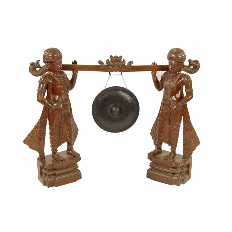 A large Anglo-Indian carved hardwood gong, with turbanned male figure supports each holding a pole carved with a dragon, birds and phoenix finials, with a hammered bronze gong, late 19th / early 20th century, 48.5in (123cm) h, 63.5in (161.2cm) w.