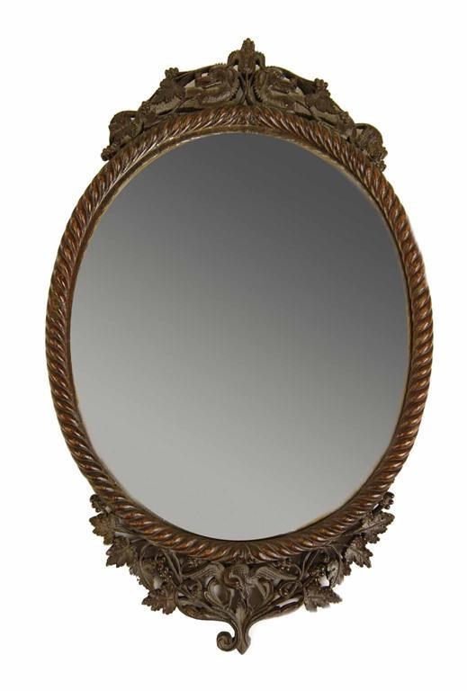A 19th century Colonial rosewood wall mirror, the oval plate to a ribbed frame, the surmount carved with two beast, leaves and berries, the conforming base with an eagle, 18 x 11in (46.2 x 28cm).