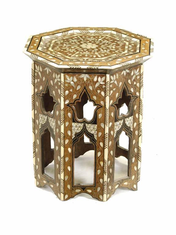 A Moorish octagonal occasional table, inlaid ivory, bone, white metal stringing and mother of pearl, the underside with a trade label inscribed 'SUPPLIED BY EDGINTON'S, CASH FURNISHERS, 263-265 HIGH STREET, LEWISHAM, S.E. 13', 18.75in (47.5cm) h, 17in (43cm) w. Old damages and restoration.