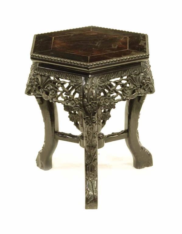 A Chinese hardwood low stand, the heaxagonal top with a beaded edge to a pierced frieze carved with flowers and foliage, 19in (48cm) h, 19in (48cm) w.