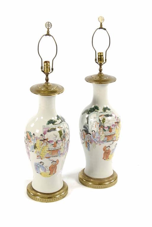 A large pair of Chinese porcelain famille rose vases, mounted and fitted as lamps, 39in (99cm) h, including fittings. (2) Damages.
