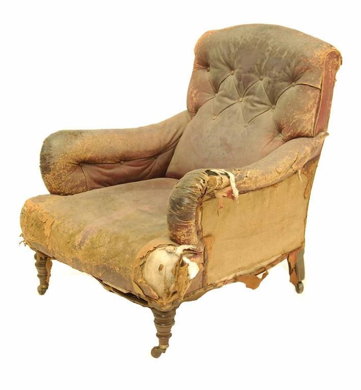 A late Victorian armchair, upholstered distressed maroon leather on turned walnut front supports and ceramic castors.