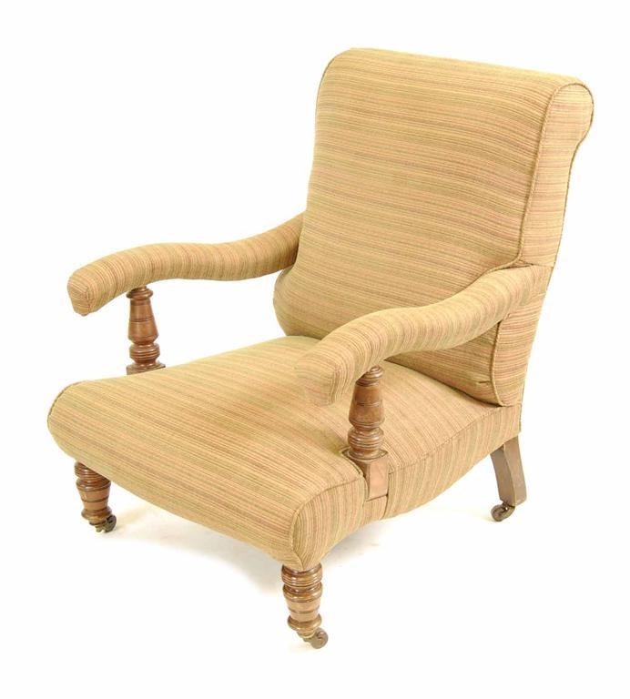 A Victorian easy open armchair, on turned walnut front supports.