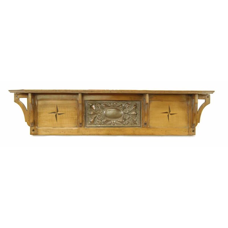 A late Victorian wall shelf, inlaid parquetry stars and inset an embossed copper panel, 9in (23cm) h, 41.25in (104.5cm) w.