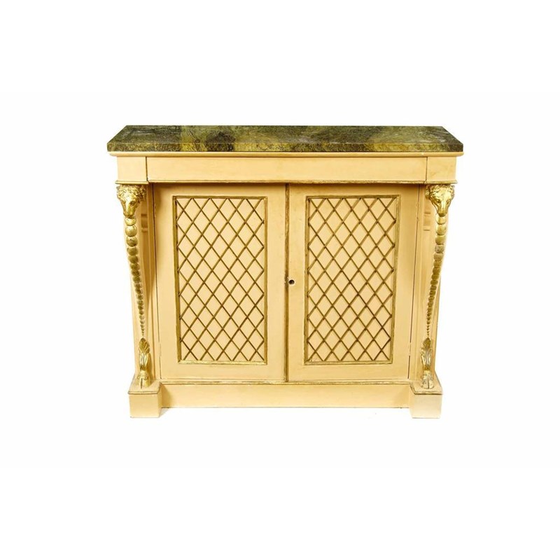 A 19th century painted and parcel gilt side cabinet, the mottled green marble top above a frieze drawer and a pair of gilt brass trellis doors enclosing a shelf, flanked by carved rams head monopodia, 37in (94cm) h, 42.25in (107.1cm) w, 15in (38cm) d. Cracks to top, later painted.