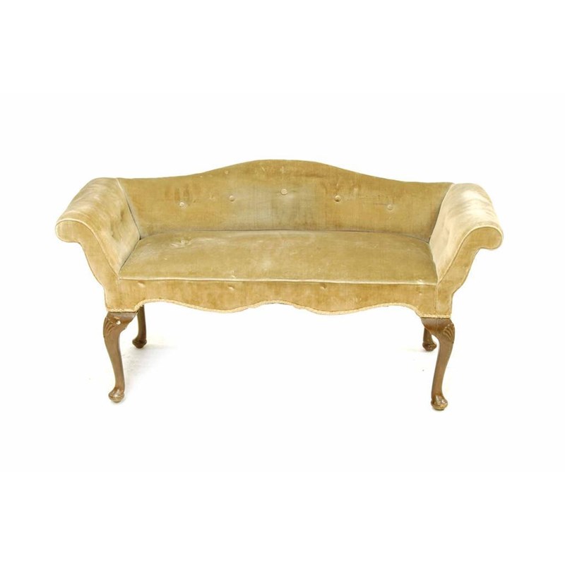 A window seat in 18th century style, with a serpentine back and scroll arms on stained beechwood cabriole legs and pad feet, 23.75in (60cm) h, 40in (117cm) w, 18in (46cm) d.