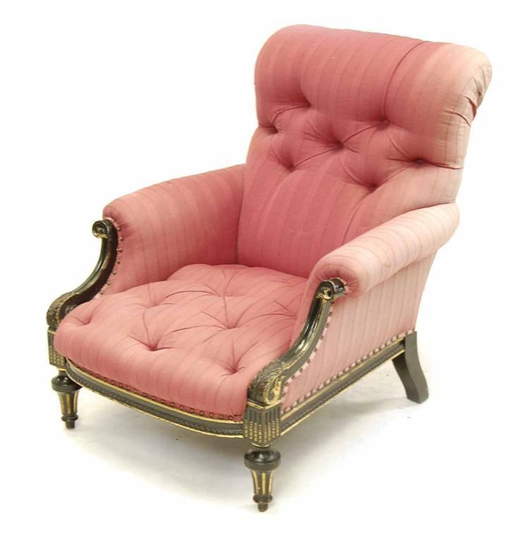 A Victorian ebonised and parcel gilt armchair, the button back and seat to scroll arms and fluted tapering legs, the back right leg stamped '7230'. Previously on castors.