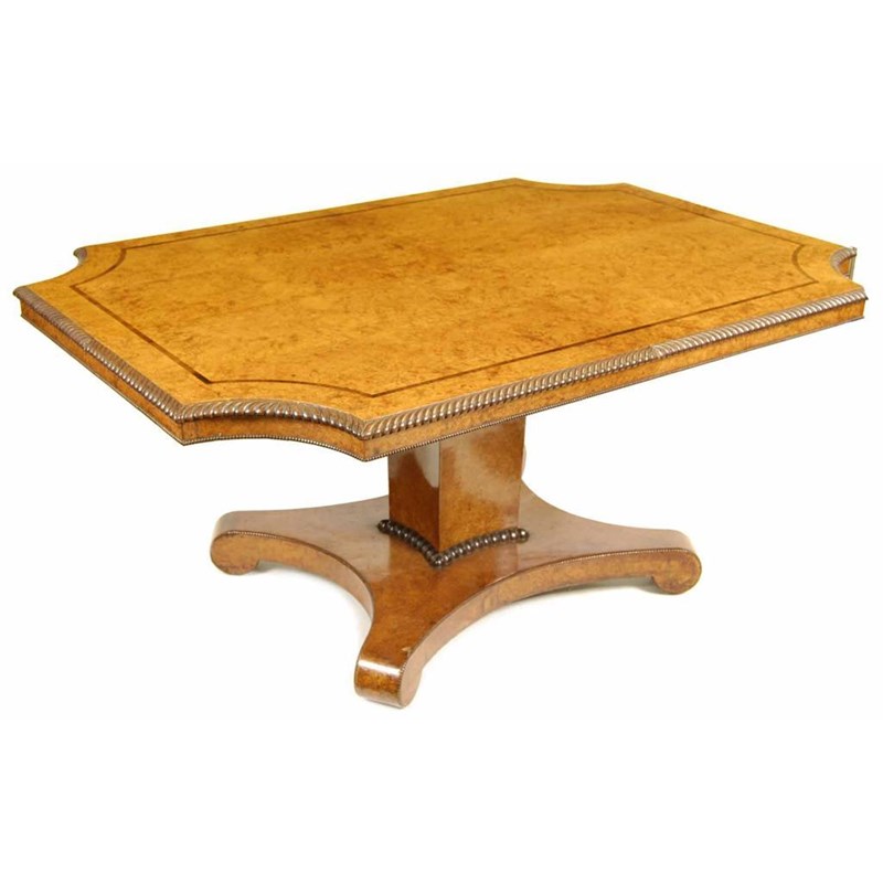 A Charles X burr maple centre table, the rectangular tilt-top with concave corners, rosewood banding and a gadroon edge, on a platform base and castors, 29.5in (75cm) h, 65.75in (166.8cm) w, 46in (117cm) d.