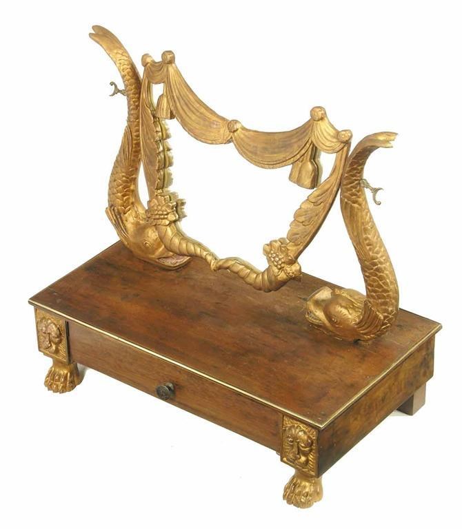 A 19th century continental walnut and giltwood dressing table mirror, the cornucopia and draped frame with a later plate, on dolphin supports to a box base with a divided frieze drawer, mask appliques on paw feet, 19.25in (49cm) h, 20.75in (52.5cm) w, 12in (30.5cm) d.