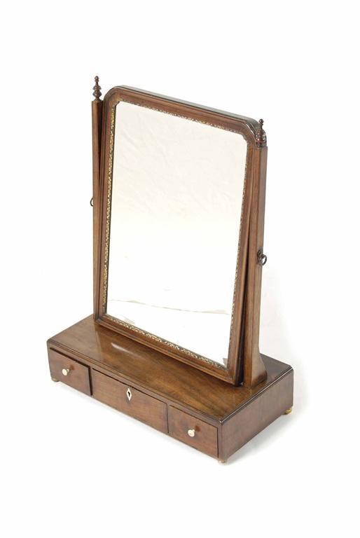 A George III mahogany dressing table mirror, the later bevelled plate to a carved gilt slip, the moulded edge base fitted three drawers, on brass ball feet, 24.25in (62cm) h, 17.75in (45cm) w, 9in (23cm) d. Restoration and replacements.