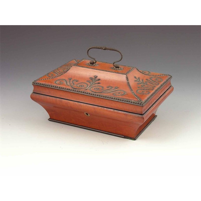 A 19th century French satinwood and cut steel sewing necessaire, of sarcophagus shape the hinged lid inset a mirror, damaged, to a velvet lined lift-out tray fitted with mother of pearl and gilt metal mounted utensils including: a seal, scissors, a cut glass scent bottle and a bodkin case, 5in (12.5cm) h, 9.75in (24.5cm) w, 6.75in (17.4cm) d. Losses and replacements.