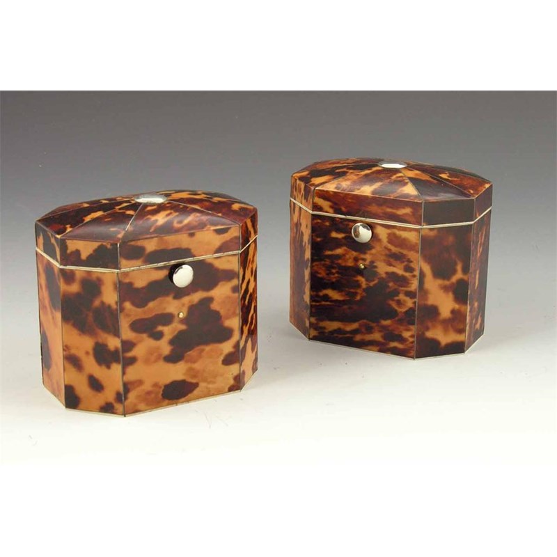 A pair of Regency octagonal tortoiseshell tea caddies