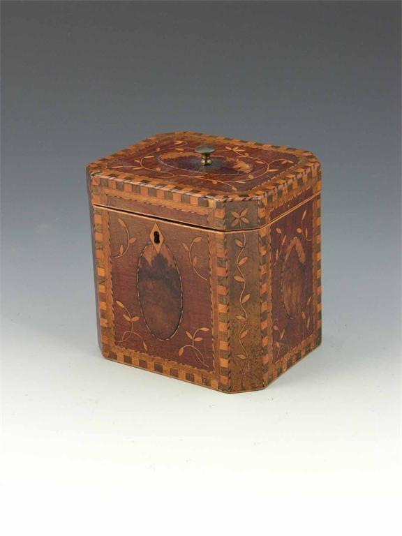 A George III rectangular tea caddy, with canted corners, having oval yew panels to harewood panels with marquetry decoration, stringing and parquetry and hinged cover with a brass handle revealing a conforming lid to the interior, 5.25in (13.5cm) h, 5in (5.5cm) w, 4in (10.2cm) d.
