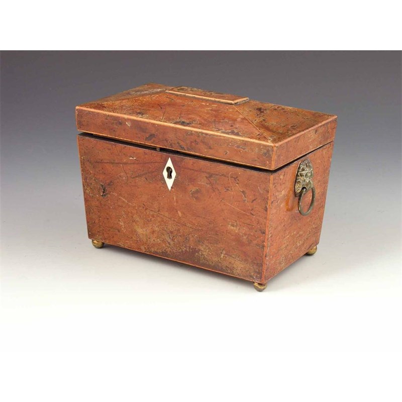 An early 19th century yew wood sarcophagus shape tea caddy