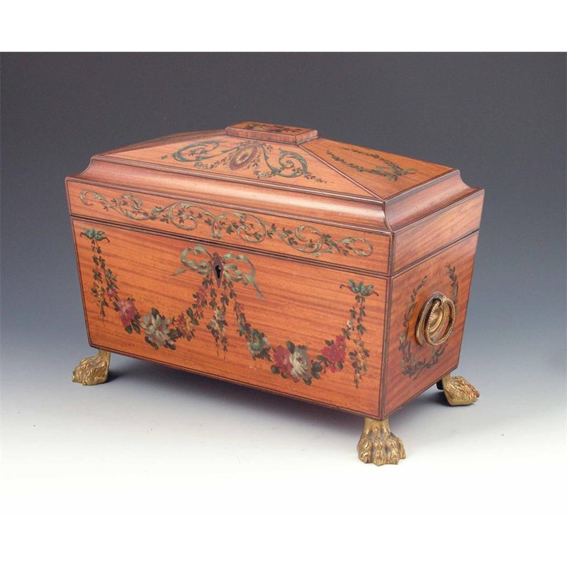 A late Victorian satinwood polychrome decorated sarcophagus shaped tea caddy, with a faceted sloping cover and tapering sides decorated scrolling and ribbon tied foliage, the interior with a pair of hinged lidded canisters, and a glass footed bowl, the sides with oval brass plate beaded handles, raised on brass plate hairy feet, 10.5in (26.5cm) h, 14.5in (37cm) w, 7.5in (19cm) d.