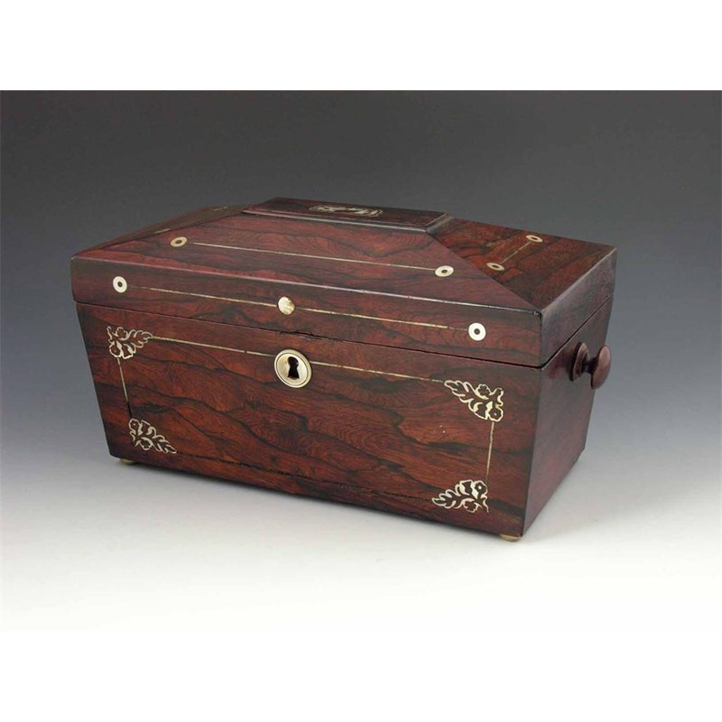 A Victorian rosewood sarcophagus shape work box, previously a tea chest, with mother of pearl and pewter inlay, the later plush lined interior with a lift-out tray, 7.25in (18.5cm) h, 12.75in (32cm) w, 6.5in (16.5cm) d.