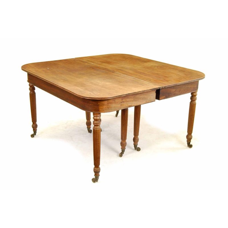 An early 19th century mahogany dining table, the reeded edge top above turned and reeded tapering legs and brass caps and castors, with four central supporting legs, 28.25in (71.8cm) h, 50.75in (129cm) w and d. Old damages and losses.
