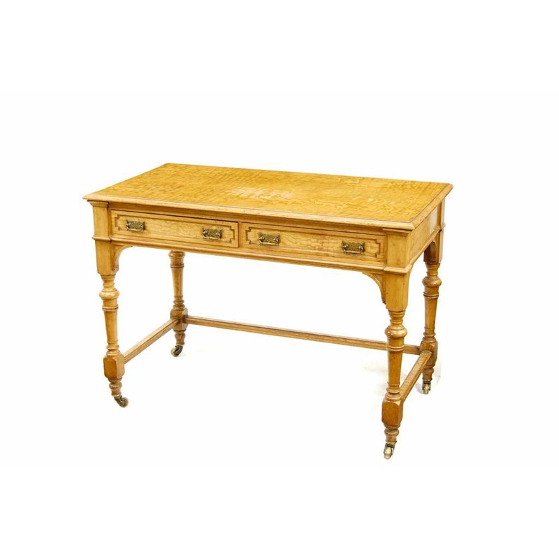 A Victorian ash side table, with two frieze drawers fitted brass handles on turned stretchered supports, on brass castors, 29in (73.8cm) h, 41.75in (106cm) w, 21.25in (54cm) d.